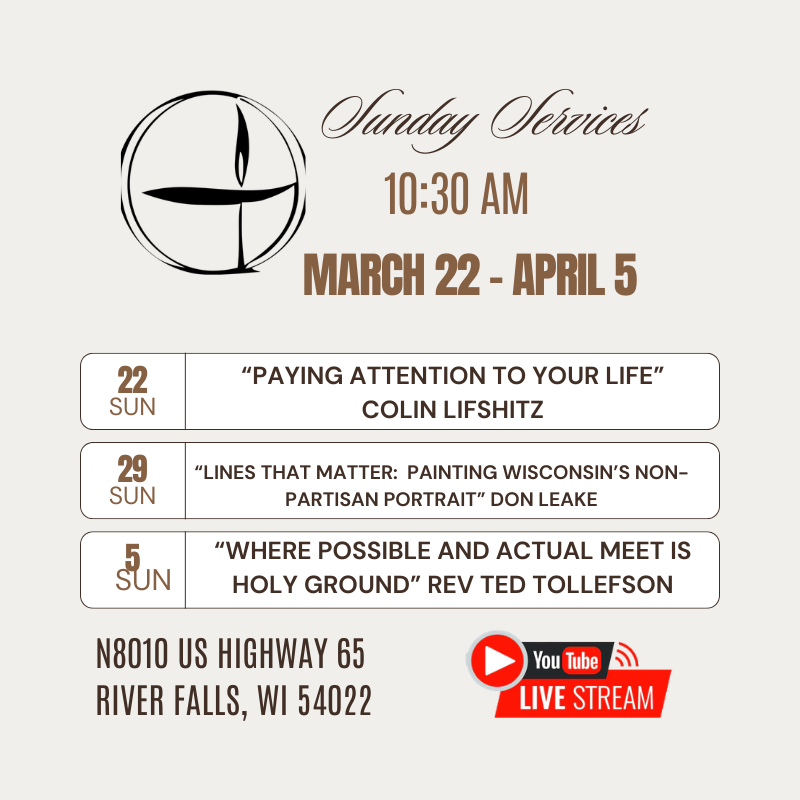 Join us in person at N8010 US Highway 65 River Falls, WI 54022 or stream live on our YouTube channel here: https://www.youtube.com/@UUSRF. CLICK TO READ MORE