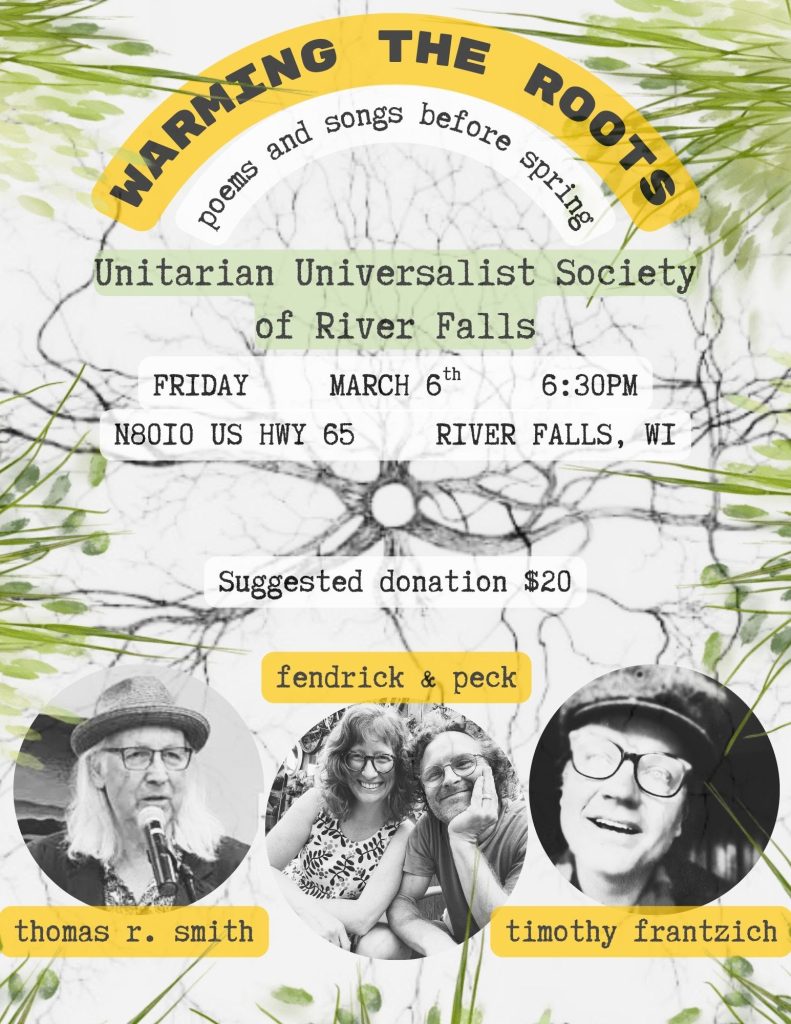 Get ready to shake off the winter blues! The Unitarian Universalist Society of River Falls is hosting a special event called “Warming the Roots: Poems and Songs Before Spring.”